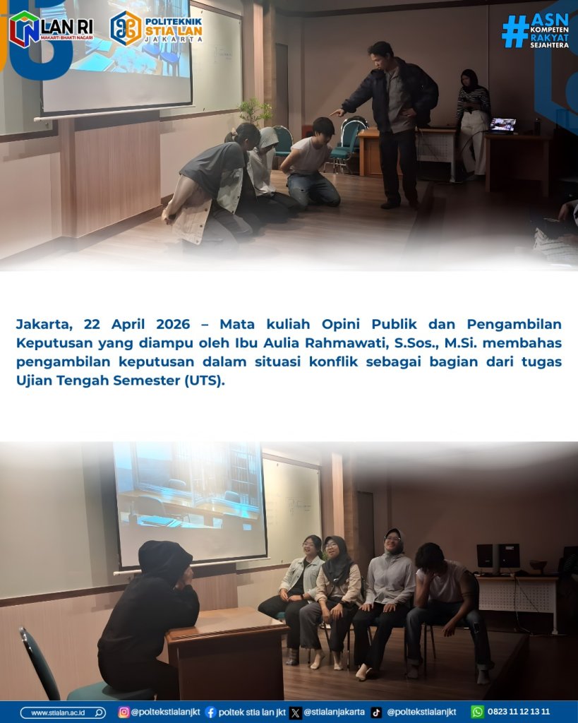 Jakarta, 22 April 2026 – Mata kuliah Opini Publik dan Pengambilan Keputusan yang diampu oleh Ibu Aulia Rahmawati, S.Sos., M.Si. membahas pengambilan keputusan dalam situasi konflik sebagai bagian dari tugas Ujian Tengah Semester (UTS).