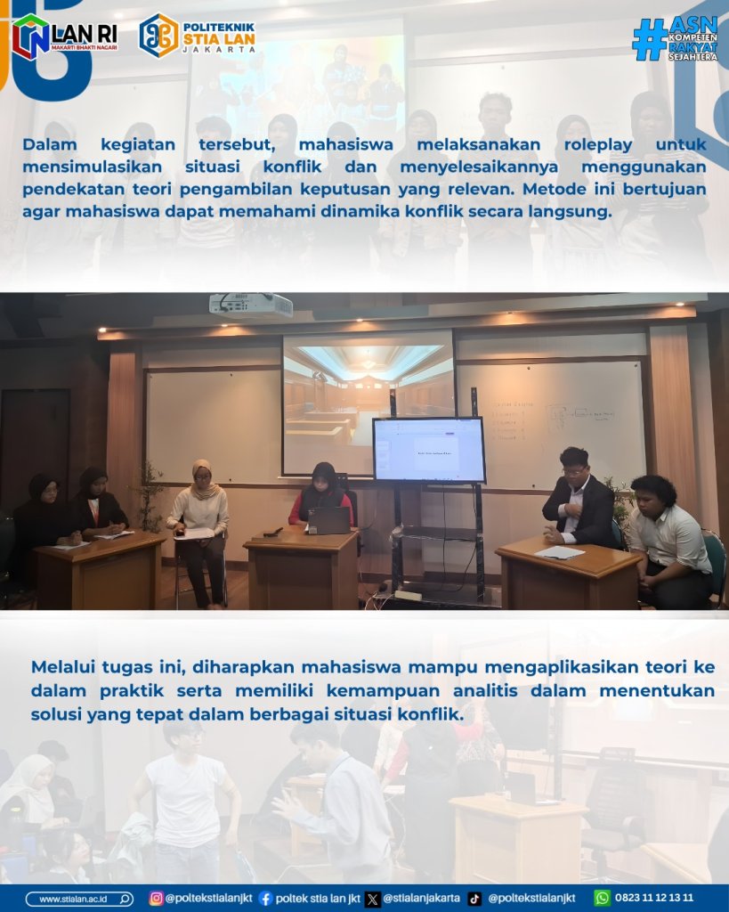 Dalam kegiatan tersebut, mahasiswa melaksanakan roleplay untuk mensimulasikan situasi konflik dan menyelesaikannya menggunakan pendekatan teori pengambilan keputusan yang relevan. Metode ini bertujuan agar mahasiswa dapat memahami dinamika konflik secara langsung.