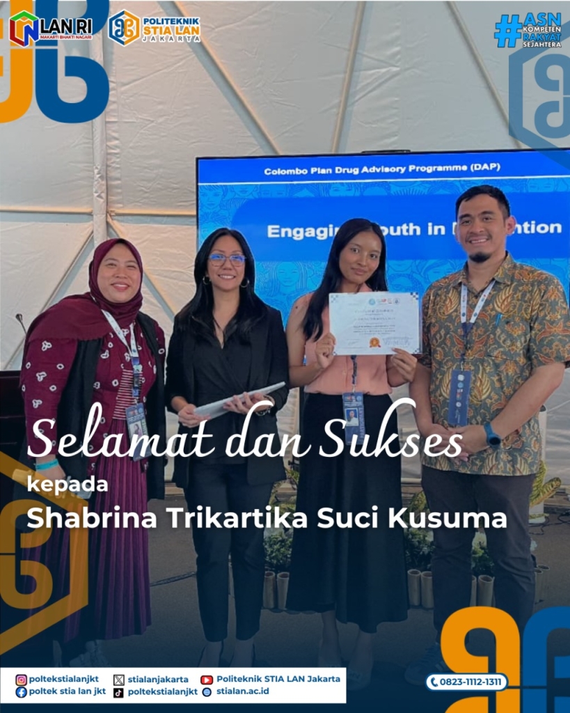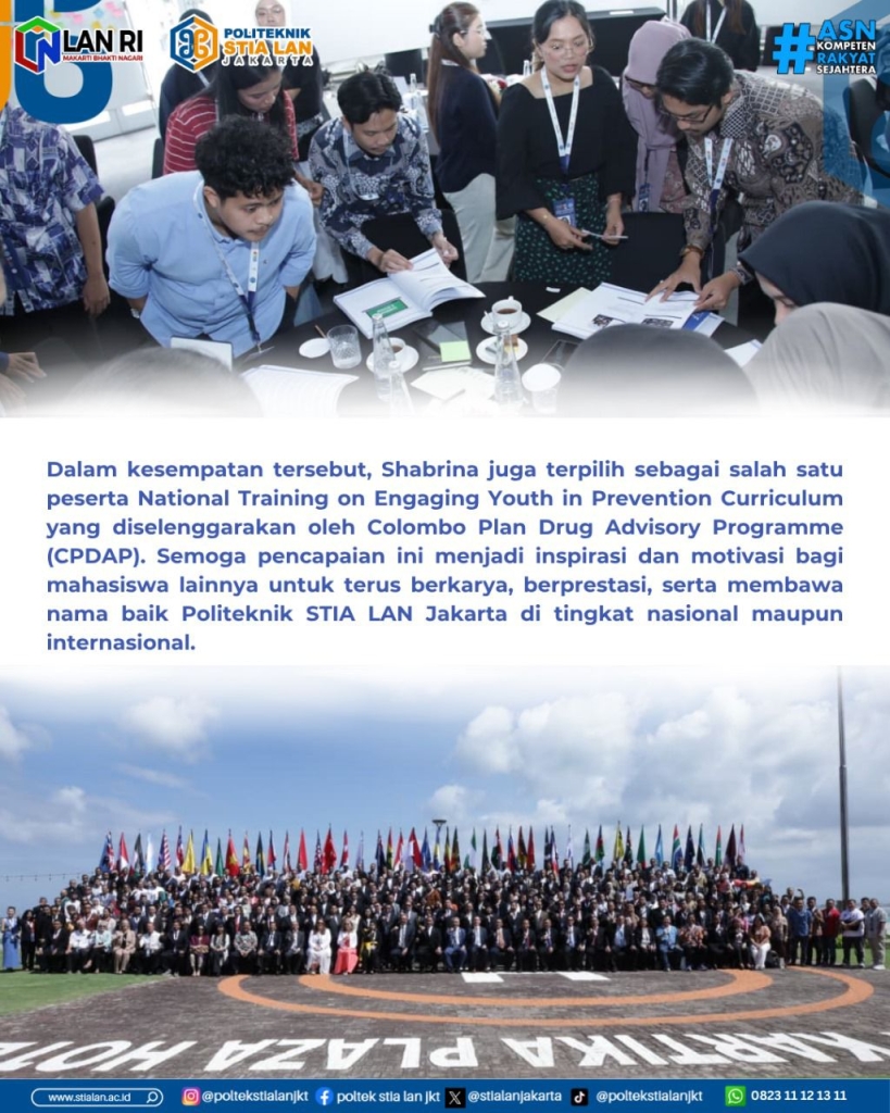 Dalam kesempatan tersebut, Shabrina juga terpilih sebagai salah satu peserta National Training on Engaging Youth in Prevention Curriculum yang diselenggarakan oleh Colombo Plan Drug Advisory Programme (CPDAP). Semoga pencapaian ini menjadi inspirasi dan motivasi bagi mahasiswa lainnya untuk terus berkarya, berprestasi, serta membawa nama baik Politeknik STIA LAN Jakarta di tingkat nasional maupun internasional.