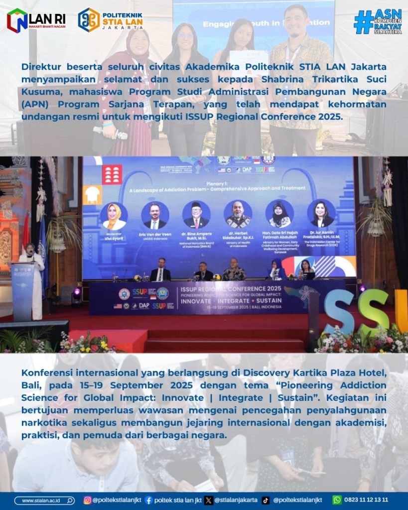 Direktur beserta seluruh civitas Akademika Politeknik STIA LAN Jakarta menyampaikan selamat dan sukses kepada Shabrina Trikartika Suci Kusuma, mahasiswa Program Studi Administrasi Pembangunan Negara (APN) Program Sarjana Terapan, yang telah mendapat kehormatan undangan resmi untuk mengikuti ISSUP Regional Conference 2025.