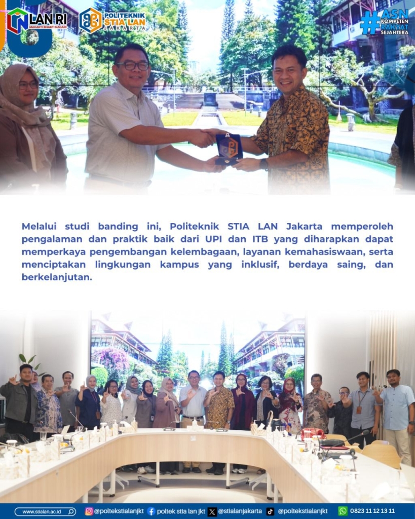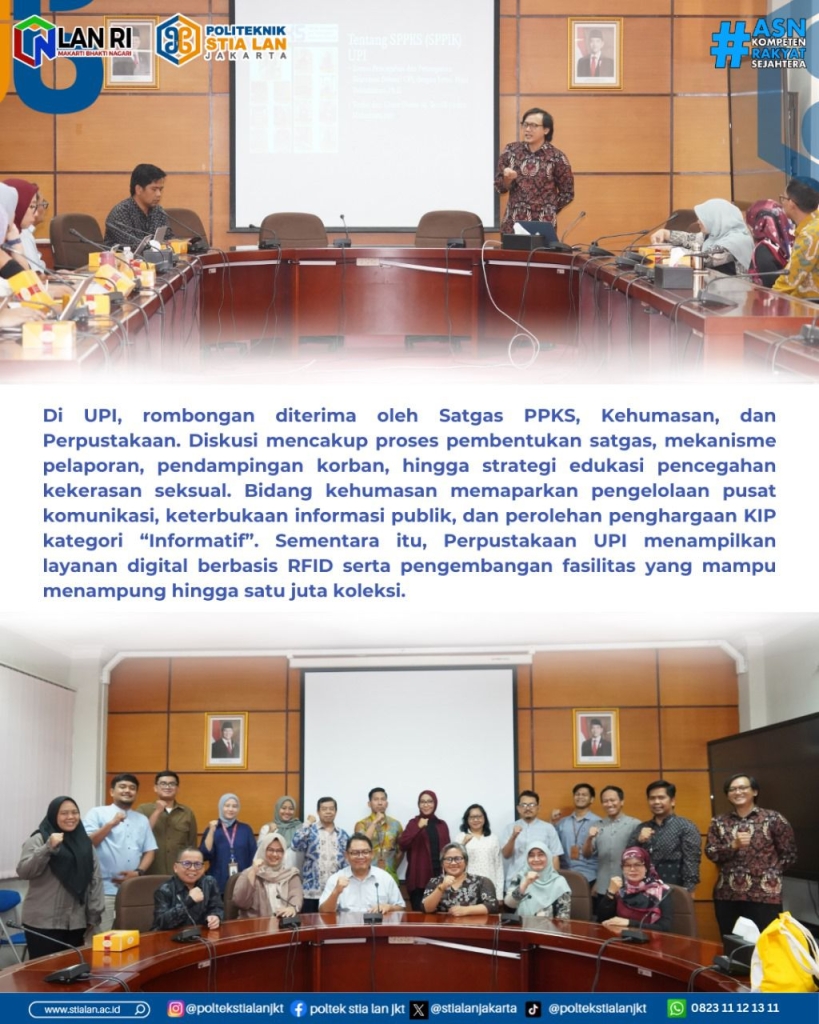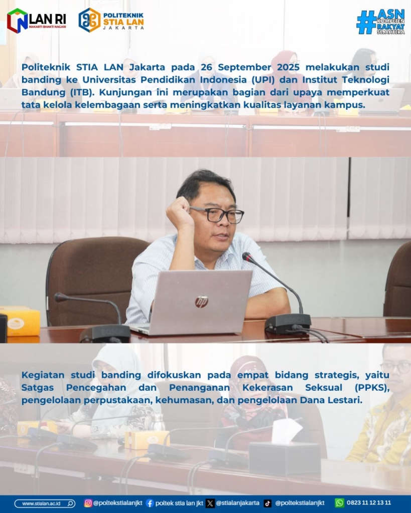 Jakarta, 29 September 2025 – Dalam upaya memperkuat tata kelola kelembagaan dan meningkatkan kualitas layanan kampus, Politeknik STIA LAN Jakarta pada 26 September 2025 melaksanakan kegiatan studi banding ke Universitas Pendidikan Indonesia (UPI) dan Institut Teknologi Bandung (ITB). Kegiatan ini difokuskan pada empat bidang strategis yaitu Pencegahan dan Penanganan Kekerasan Seksual (PPKS), pengelolaan perpustakaan, kehumasan, dan pengelolaan Dana Lestari.