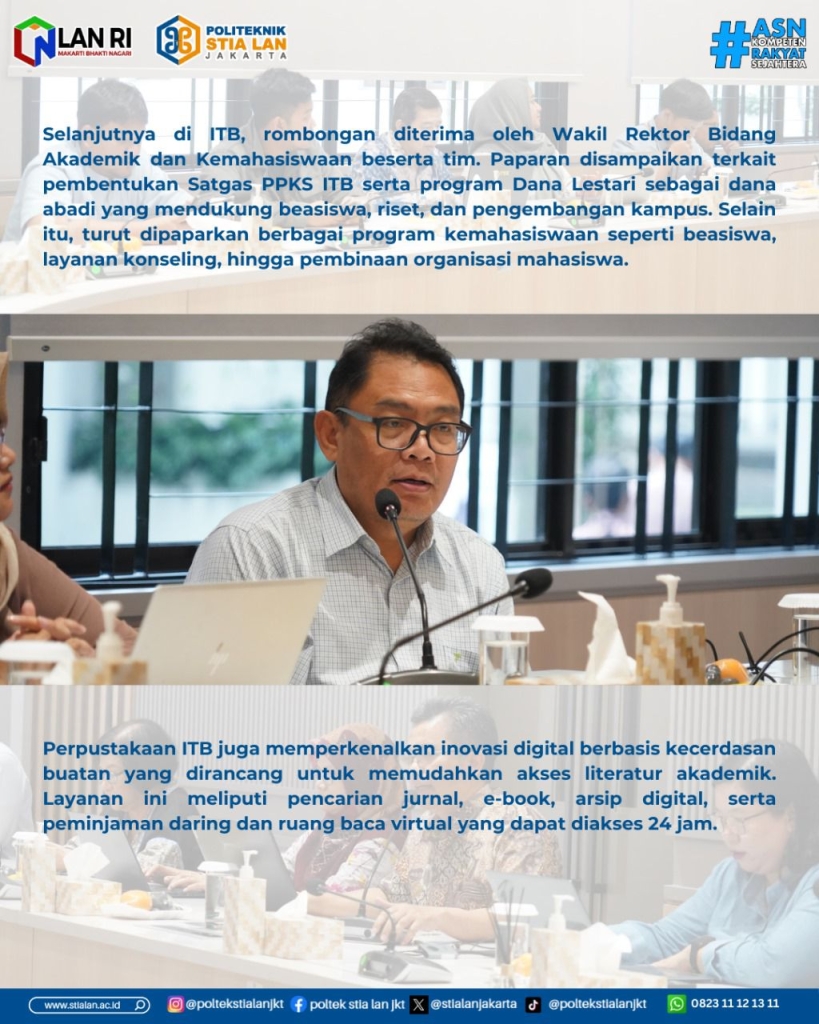 Setelah itu rombongan melakukan kunjungan ke ITB dan rombongan diterima olehWakil Rektor Bidang Akademik dan Kemahasiswaan Prof. Dr. Irwan Meilano, S.T., M.Sc. dan Tim ITB. Dari Politeknik STIA LAN Jakarta Wakil Direktur III Bidang Kemahasiswaan, Edy Sutrisno menyampaikan ucapan terima dan penghargaan yang setinggi-tingginya atas penerimaan rombongan yang sangat baik dan ramah. Edy menyampaikan bahwa kedatangan rombongan ingin belajar dan melihat lebih jauh praktek yang sudah dilaksanakan oleh ITB mengenai Satgas PPKS, Kemahasiswaan, Perpustakaan, dan Dana Lestari Abadi.