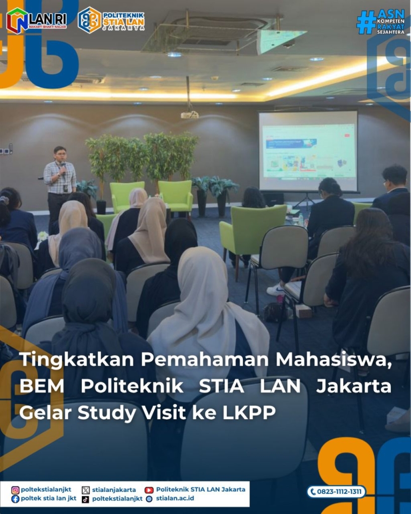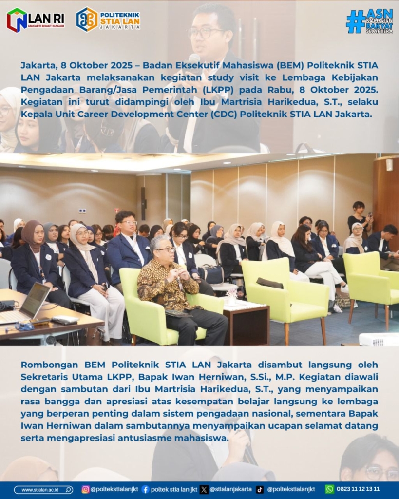 Jakarta, 8 Oktober 2025 – Badan Eksekutif Mahasiswa (BEM) Politeknik STIA LAN Jakarta melaksanakan kegiatan study visit ke Lembaga Kebijakan Pengadaan Barang/Jasa Pemerintah (LKPP) pada Rabu, 8 Oktober 2025. Kegiatan ini turut didampingi oleh Ibu Martrisia Harikedua, S.T., selaku Kepala Unit Career Development Center (CDC) Politeknik STIA LAN Jakarta.