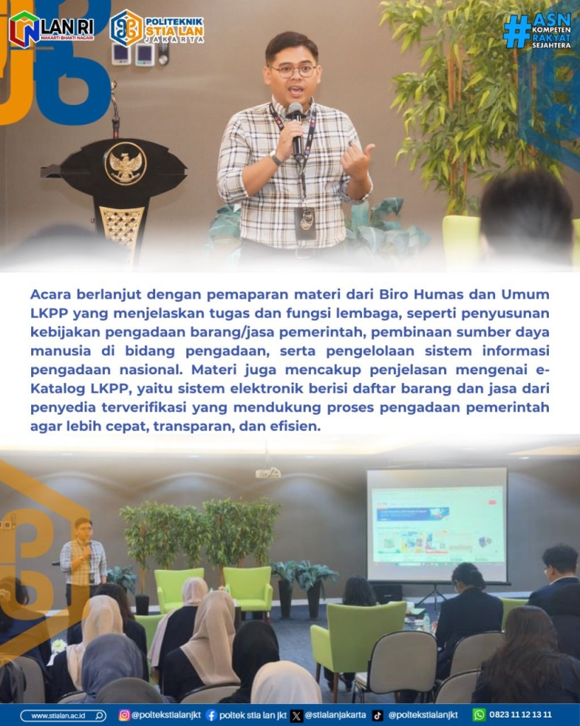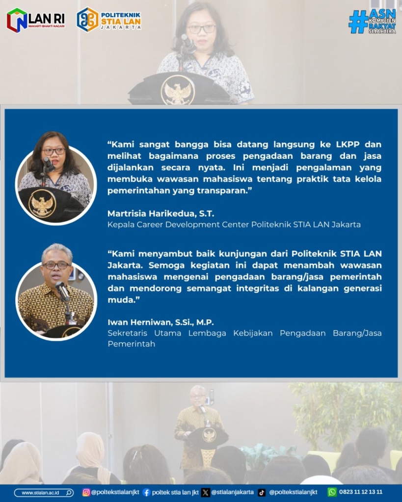 “Kami menyambut baik kunjungan dari Politeknik STIA LAN Jakarta. Semoga kegiatan ini dapat menambah wawasan mahasiswa mengenai pengadaan barang/jasa pemerintah dan mendorong semangat integritas di kalangan generasi muda,” tuturnya.