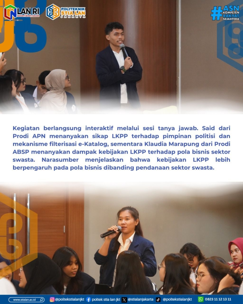 Kegiatan berlangsung interaktif melalui sesi tanya jawab antara mahasiswa dan narasumber. Said dari Prodi Administrasi Pembangunan Negara (APN) menanyakan sikap LKPP terhadap pimpinan dari kalangan politisi serta mekanisme filterisasi barang dan jasa dalam e-Katalog. Sementara itu, Klaudia Marapung dari Prodi Administrasi Bisnis Sektor Publik (ABSP) menanyakan pengaruh kebijakan LKPP terhadap pola bisnis penyedia barang/jasa di sektor swasta. Narasumber menjelaskan bahwa kebijakan LKPP tidak langsung memengaruhi sektor swasta dari sisi pendanaan, namun berdampak signifikan pada pola bisnis berdasarkan jenis dan sektor penyedia.