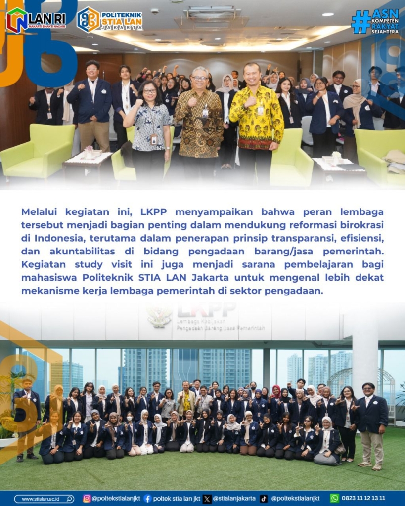 Melalui kegiatan ini, LKPP menyampaikan bahwa peran lembaga tersebut menjadi bagian penting dalam mendukung reformasi birokrasi di Indonesia, terutama dalam penerapan prinsip transparansi, efisiensi, dan akuntabilitas di bidang pengadaan barang/jasa pemerintah. Kegiatan study visit ini juga menjadi sarana pembelajaran bagi mahasiswa Politeknik STIA LAN Jakarta untuk mengenal lebih dekat mekanisme kerja lembaga pemerintah di sektor pengadaan.