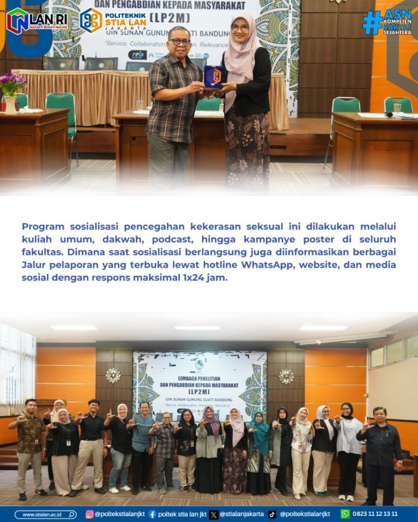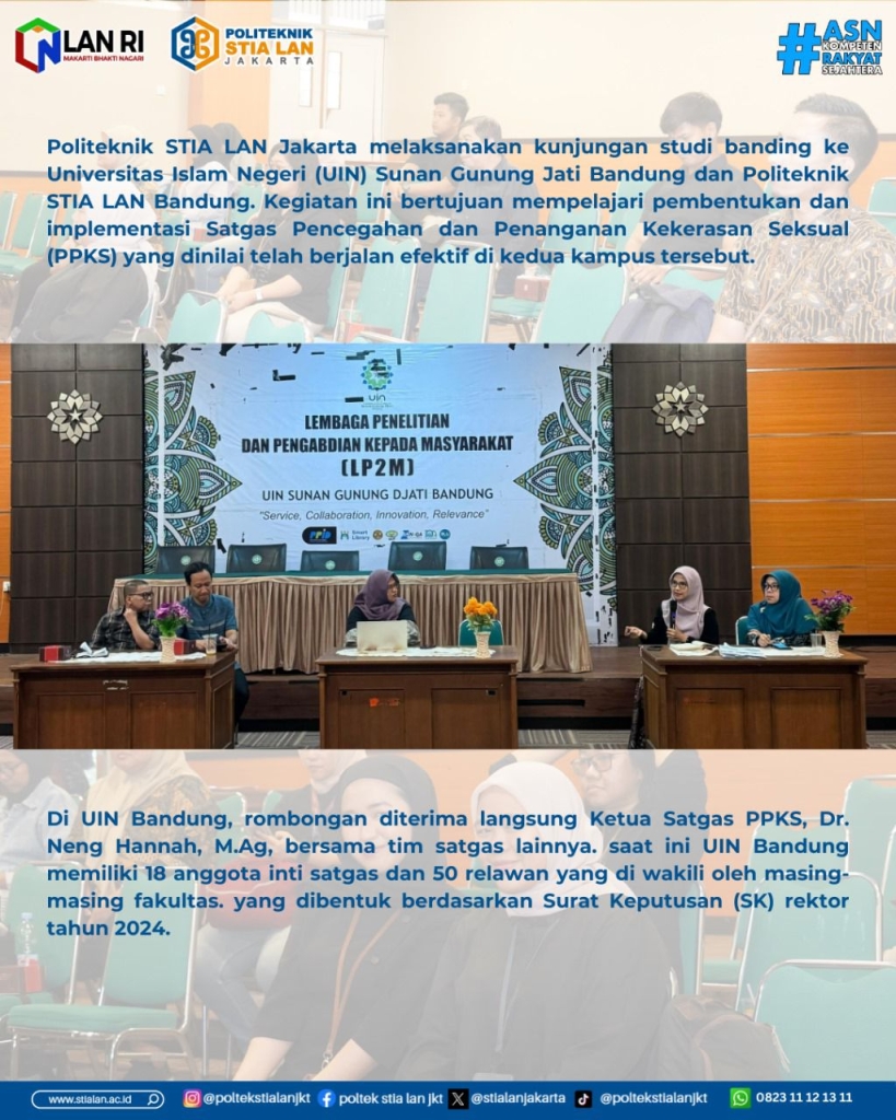 Bandung, 24 September 2025 – Politeknik STIA LAN Jakarta melaksanakan kunjungan studi banding ke Universitas Islam Negeri (UIN) Sunan Gunung Jati Bandung dan Politeknik STIA LAN Bandung. Kegiatan ini bertujuan mempelajari pembentukan dan implementasi Satgas Pencegahan dan Penanganan Kekerasan Seksual (PPKS) yang dinilai telah berjalan efektif di kedua kampus tersebut.