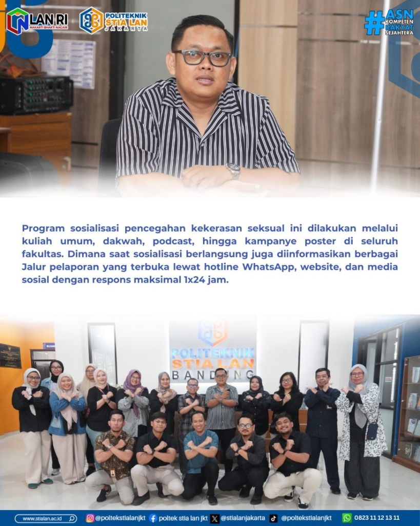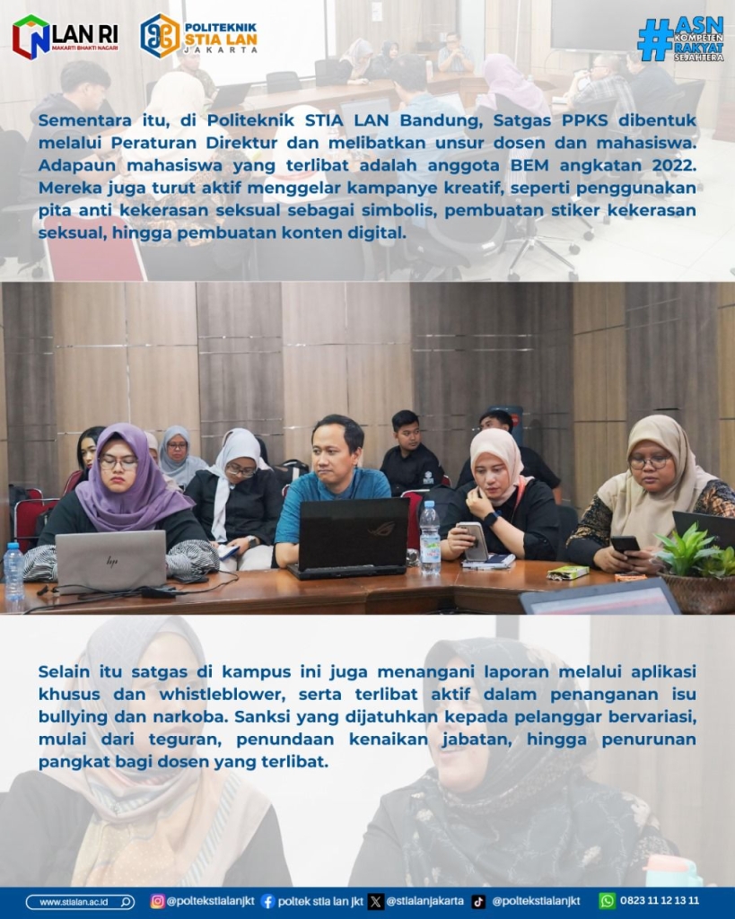 Sementara itu, di Politeknik STIA LAN Bandung, Satgas PPKS dibentuk melalui Peraturan Direktur dan melibatkan unsur dosen dan mahasiswa. Adapaun mahasiswa yang terlibat adalah anggota BEM angkatan 2022. Mereka juga turut aktif menggelar kampanye kreatif, seperti penggunakan pita anti kekerasan seksual sebagai simbolis, pembuatan stiker kekerasan seksual, hingga pembuatan konten digital.